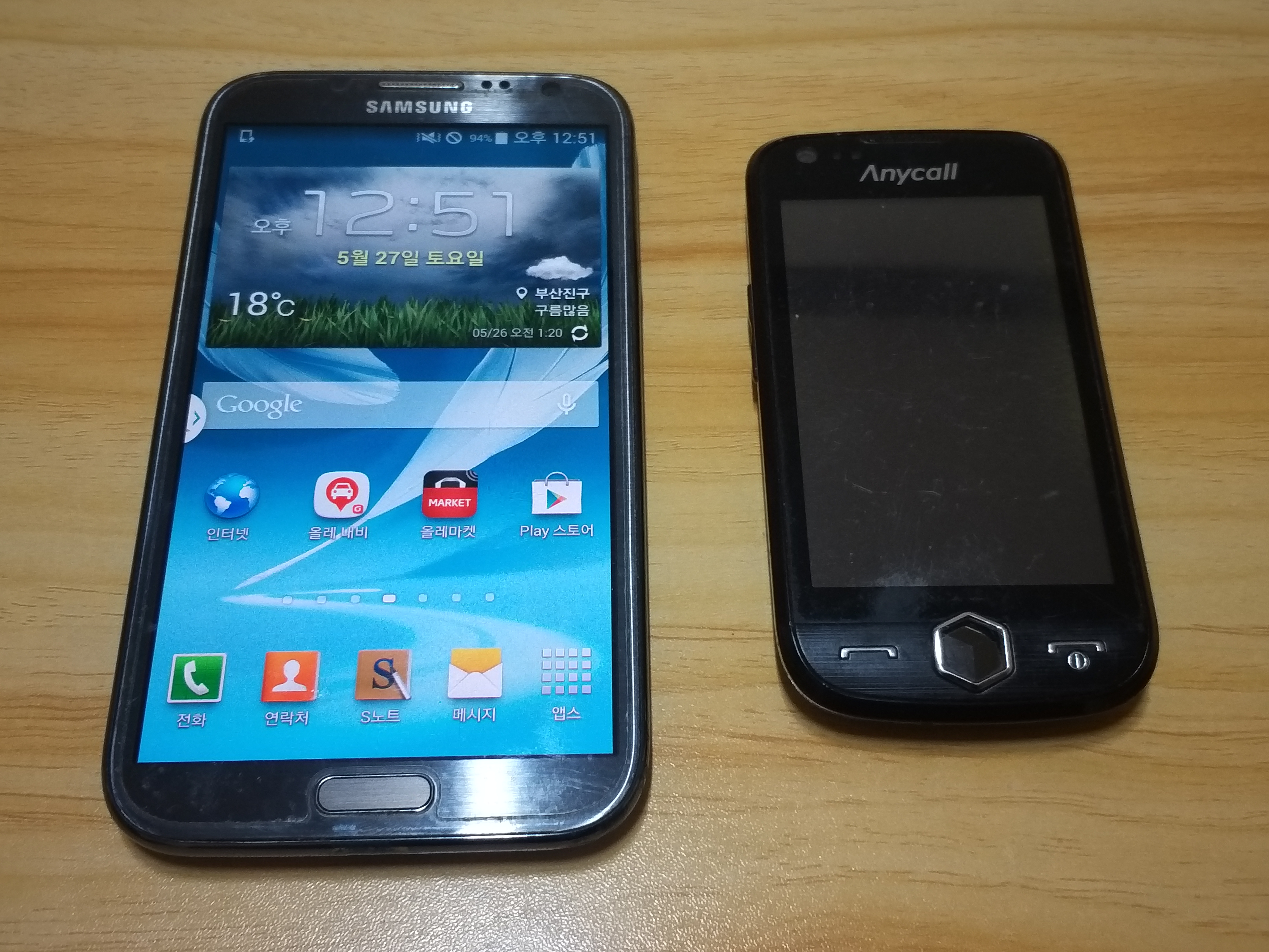 5월 25일에 삼성 Galaxy Note II와 삼성 Anycall Haptic Amoled를 주워왔는데 Galaxy Note II는 5핀 케이블로 충전하여 사용할 수 있었지만 Haptic Amoled는 배터리가 다된 건지 켜지지 않고 충전도 20핀 단자가 있어야 하는데 20핀을 가지고 있지 않아 차후에 따로 구매하여 작동여부를 확인할 예정이다. 그리고 Galaxy Note II가 옛날 폰이라 그런지 제대로 된 온라인이 불가능하여 가능하면 Android 버전 업을 해볼 생각이다.